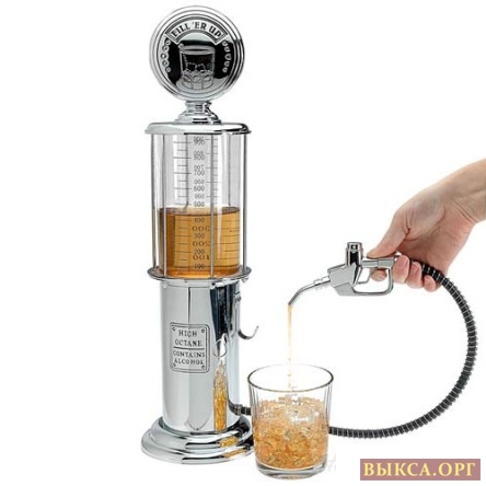 Миниатюрная станция-бар 1л и высотой 49 см «заправляет» любым «горючим». Водка, вино или просто компот — на усмотрение хозяина. «Горючее» из верхней прозрачной пластиковой колбы самотеком по резиновому шлангу через «пистолет» при нажатом рычаге попадает прямиком в заранее подготовленные стаканы.