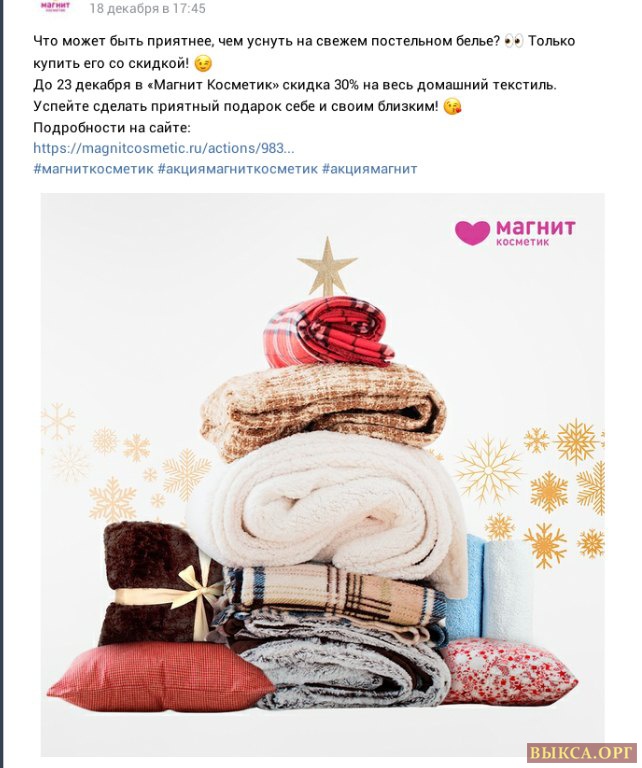 Порадуйте себя и своих близких подарками. А магнит Косметик Вам в этом поможет. Скидка на домашний текстиль -30% и скидка на весь парфюм -50%.