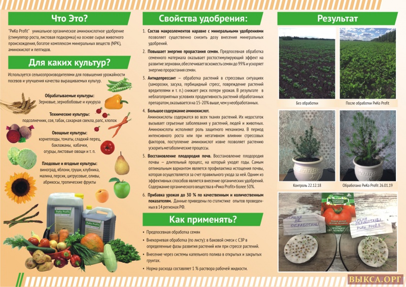 Производитель ГК «Баланс» предлагает к поставке уникальное органическое аминокислотное удобрение «РиКо Profit» пролонгированного действия. Состав: Азот 30,8 %. Фосфор 5,15%. Калий 9,8%. Массовая доля органического вещества 51,7 %. Содержит аминокислоты и пептиды. Производится из животного сырья путем переработки с последующей фильтрацией. Данное сырье известно большим содержанием кератина, который в процессе разложения выделяет большое количество минеральных веществ и аминокислот, нужных растению. Жидкая форма удобрения способствует полному впитыванию полезных веществ растением и почвой, исключая выветривание. Применяется при выращивании таких культур как зерновые, масличные, бобовые, овощные, бахчевые, плодовые, кормовые, технические и прочее. Используется при предпосевной обработке почвы, обработке семян, листовых подкормок. Обработка семян: Норма расхода 0,3-0,5 л/т 1 тонну семян в баковой смеси с СЗР. Норма расхода рабочей жидкости при обычном опрыскивании 150-300 л/га. Зерновые, зернобобовые и кукуруза: 1,5-2,0 л/га (кущение – выход в трубку + колошение или стресс). Технические культуры: (подсолнечник, соя, табак, сахарная свекла, рапс, хлопок): 1,5-3,0 л/га. Плодовые и ягодные культуры: (виноград, яблони, груши, клубника, малина, персик, цитрусовые, оливы, абрикосы, тропические фрукты): 2,0-3,0 л/га., перед цветением, завязью, формированием плода и во всех случаях вегетативных задержек и стрессов. Овощные культуры: (томаты, сладкий перец, баклажаны, кабачки, огурцы, листовые овощи, корнеплоды и т.п.): 2,0-3,0 л/га в открытом грунте. В защищенном грунте — 1-2 л на 1 (одну) сотку, применяя каждые 10-15 дней, после высадки.
