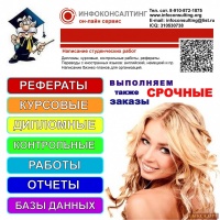 Рефераты, контрольные, курсовые работы, дипломы, бизнес-планы, презентации, практики, базы данных, программирование, переводы с иностр.языков. Поднятие оригинальности работы (антиплагиат). Гарантия качества. Сопровождение до защиты. Тел.8-910-872-1875