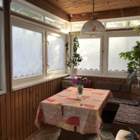 На первом этаже домa холл (21 кв.м), гостиная (27 кв.м), спальня (22 кв.м) , кухня (16 кв.м), санузел (8 кв.м) , веранда (4 кв.м).